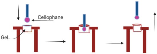 Cellophane membrane (Thermo Fisher Scientific) was used as a model membrane to evaluate muco-adhesion of the films as described by Kumar et al. [32]. The cellophane was hydrated with artificial saliva for an hour at room temperature before use. Then, the hydrated cellophane was cut into a proper size to fit the muco-adhesion support ring and the probe. The test was started after 15 min of equilibration at 37 °C. The films were dissolved in artificial saliva to form a gel and the gel was then loaded into the rig and the test was started 5 min after loading the gel into the rig. A flat-faced probe (TA-10) moved at the speed of 1 mm/s until it touched the gel in the rig (Figure 1). On contact, 0.2 N force was applied for 60 s and the probe was withdrawn at a speed of 1 mm/s. The force required for the probe to detach from each film was recorded as the adhesion force of the films. Adhesion force was measured in triplicate for each film (Figure 1).