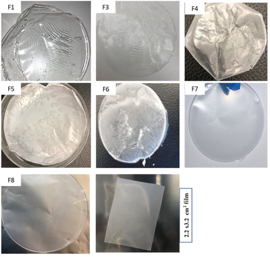 Before incorporating the drug into the polymer solution, blank films were prepared and visually evaluated. Formulations that did not homogeneously coat the casting surface, form pores, or could not be peeled off, were discarded. The drug was incorporated into a blank formulation that formed a good film. Films made of polymer alone were difficult to peel and brittle. Different plasticizers were, therefore, evaluated during the preliminary experiments. The main purpose of using plasticizers is to provide flexibility and improve peelability. Among the used plasticizers, glycerin and PEG provided the desired effect; however, glycerin made the film surface oily. Hence, PEG was selected for the final formulations. Films based on only PVA as a polymer were transparent, thin, and showed stretch marks upon solvent evaporation (Figure 2; Film 1). Adding HPMC into a PVA formulation resulted in a transparent and relatively thick film (Figure 2; Film 3). The ratio of HPMC, PVA, and PEG was optimized to develop a film with a good property. Films based on Kollicoat were transparent, dry, and difficult to peel from the casting surface (Figure 2; Films 4 and 5).