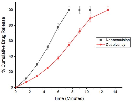 The in vitro drug release studies showed that films prepared by both approaches showed rapid release of estradiol. The films prepared by the nano-emulsion approach released the drug faster. At 6 min, about 80% of the drug was released from films prepared by nano-emulsion approach, whereas it took around 10 min to obtain comparable release from films prepared by the co-solvency method. It took around 7.5 min to get complete release of the drug from films prepared by the nano-emulsion approach, whereas complete release was achieved at 13 min for films prepared by the cosolvency method. The fast release of estradiol from films prepared by nano-emulsion could be attributed to the drug delivery system (Figure 4).
