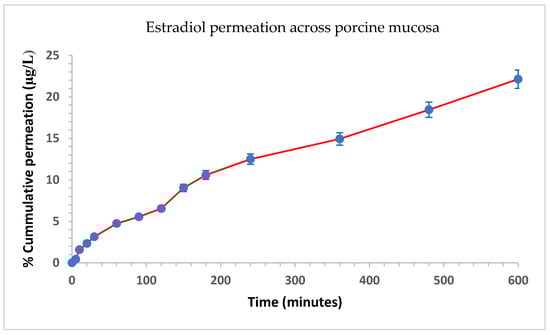 Permeation of the estradiol across freshly excised (<2 h) porcine buccal mucosa was investigated at 37 °C in Franz diffusion cells (n = 3), with a 2.54 cm2 diffusion area and a compartment volume of 5.2 mL. The receptor chamber was filled with PBS pH 7.4, and the porcine epithelium was mounted between the acceptor and donor compartments. The estradiol film was cut into the size (2.54 cm2) and carefully attached to the porcine mucosa. The film was then wetted by adding 400 µL of SSF. Aliquots (1 mL) were withdrawn from the receptor at different time points and dried with nitrogen gas to remove the solvents. The receptor chamber was immediately replenished with an equal volume of fresh and preheated (37 °C) PBS. At the end of the experiment, the buccal tissue was immersed in 10 mL HPLC mobile phase and sonicated for 1 h, to recover the accumulated amount of drug. Quantification of the API was accomplished by HPLC. The steady-state mass flux (Jss) was determined as the slope of the cumulative mass–time plotted curve (linear fraction). Calculation of the apparent permeability coefficient (Papp) was achieved by utilizing equation Papp = Jss/Cd, where Cd is the initial donor-associated API concentration.