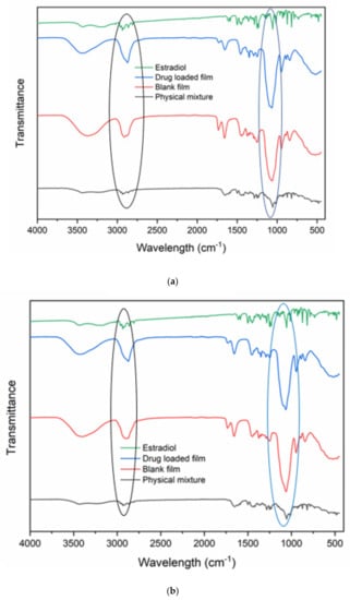FTIR spectra of pure drug, physical mixtures, blank film, and drug-loaded film were recorded using an ATR-FTIR Perkin Emler spectrum 400 USA, FTIR instrument. The spectra were obtained at a frequency range of 4000–400 cm−1 with a resolution of 4 cm−1 and 12 scanning rates. The powders and films were placed on the ATR diamond crystal, and subsequently, a force was applied with the use of the clamp to ensure that the samples made adequate contact with the diamond crystal. Spectra were recorded over a range of 4000 to 400 cm−1.