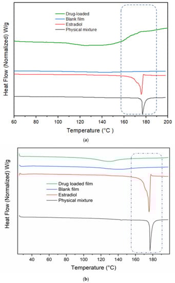 The thermal behaviour of the pure drug, physical mix, and films was studied using Discovery DSC 2920 from TA Instruments (New Castle, DE, USA) calibrated with an indium standard. Pure drug, physical mix, and the films were accurately weighed (2.0 ± 0.5 mg) and placed in the aluminium pans and heated from room temperature to 200 °C under a nitrogen atmosphere with a heating rate of 10 °C/min.