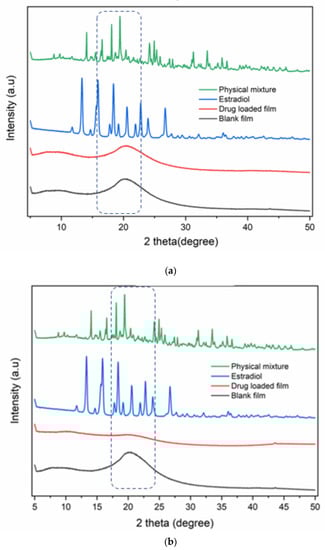 In recent years, significant interest has been shown in the development of mucoadhesive buccal films using bio-adhesive polymers. They are innovative approaches and considered patient-centric dosage forms with high patient acceptability. Characteristics such as small size, comfort, ease of application, storage, handling, and the possibility of taking them with no or just a little water make them an ideal delivery system for most drugs [12]. The buccal transmucosal administration of drugs is a non-invasive and simple route for systemic administration of drugs. It offers several advantages over other routes of administration, such as the rapid onset of action due to its rich vascularization, bypassing the enzymatic degradation of the gastrointestinal tract, avoiding the first-pass metabolism, and possibly improving bioavailability [13,14]. Furthermore, the oral cavity and buccal mucosa are easy to access, which makes application as well as the removal of a drug simple for the patient or the caregiver [15]. This route is exceptionally beneficial for drugs that undergo extensive hepatic first-pass metabolism including estradiol, which has only about 5% oral bioavailability [16]. Previous studies have indicated that hormones such as estrogen and progesterone, in troche formulations, were readily absorbed via the buccal mucous membrane, and their peak plasma concentrations were comparable to those found normally in young menstruating women [17]. The serum concentration and bioavailability of estradiol have been increased by 10- and 5-fold when administered by buccal route compared to the oral route [18].