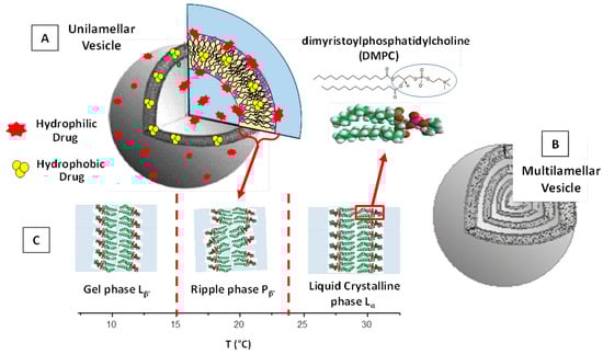 Schematic representation a DMPC unilamellar liposome (A). Typical onion-like structure composed of concentric bilayer surfaces (hydrated multilayers) of a multilamellar vesicle (MLV) (B). Characteristic phases of a water solution of DMPC phospholipids (C).