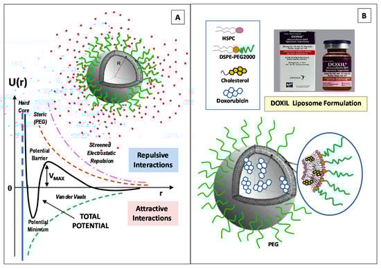 In Figure 2A, we report the main interactions exhibited by liposomes. We also report the main features of the (first FDA-approved) Doxil anticancer nanoformulation, a PEGylated liposome doxorubicin nanoformulation, for the treatment of epithelial ovarian Kaposi’s sarcoma [16,17,18]. The energy barrier which results from the balance between attractive and repulsive forces prevents the aggregation (adhesion) of two nanocarriers while approaching one another. The control over the nanocarriers’ soft interactions represents, then, a fundamental step for the design and engineering of the colloidal stability and biocompatibility of the liposomes, in view of overcoming the number of obstacles and biological barriers found in biological system [3,58].