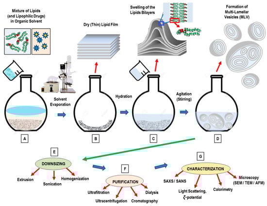Schematic representation of the main stages of the thin-film hydration method of liposome preparation. The main lipid components (and eventually lipophilic drugs/macromolecules) are dissolved in organic solvent (A). After the evaporation of the solvent, a dry (thin) lipid film is formed (B). The lipid film is then rehydrated in a saline buffer (eventually containing hydrophilic dugs to be entrapped), causing a swelling of the lipid bilayers’ stacks (C). The successive agitation/stirring of the sample favors the formation of (polydispersed) multilamellar vesicles (D). The final stages of the production process include the liposomes’ downsizing (E), purification (F), and characterization (G).