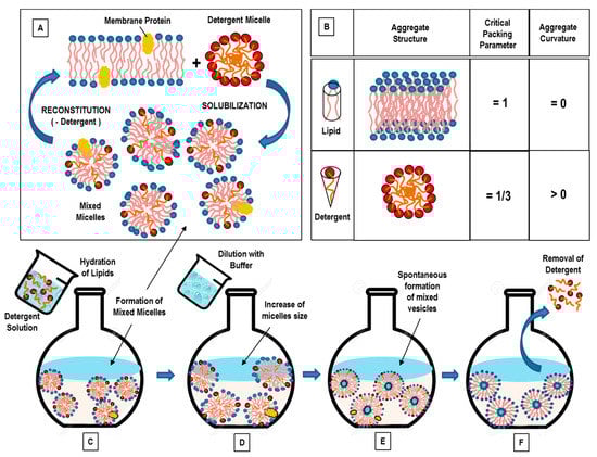 The self-assembly process which underlies the detergent removal method is driven by the molecular structure of the involved amphiphiles (Figure 4A). Most of phospholipids have a cylindrical molecular conformation (and then a critical packing parameter of CPP = 1), and in aqueous solution, they likely form bilayers (curvature = 0). On the contrary, most detergents have a cone structure (with CPP = 1/3), and favor the formation of micellar aggregates in solution (Figure 4B). When lipid bilayers (which can include proteins) interact with a (micellar) detergent solution, lipid–protein–detergent mixed micelles are formed (solubilization). The formation process can be reversed by removing the detergent (reconstitution) (Figure 4A). The characteristic molecular geometries’ and aggregates’ structures of (pure) lipids and detergents are also reported (Figure 4B). In Figure 4C–F, we report the main stages of the detergent removal method.