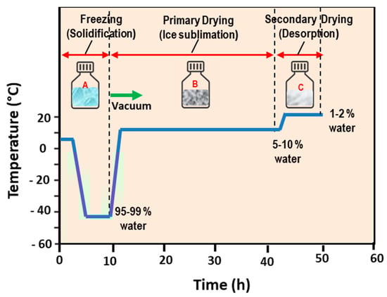 Schematic representation of the main stages of the freeze-drying (lyophilization) method. After the loading of the sample container (in flasks/vials), the system undergoes an initial freezing at atmospheric pressure, which is characterized by the formation of ice crystals (A), followed by a primary drying (ice crystal sublimation) (B) under vacuum. A secondary drying under vacuum favors the desorption of unfrozen water (C). Finally, the sample (product in vials) undergoes a backfill and stoppering process under partial vacuum, followed by the removal of the dried product from the freeze dryer.