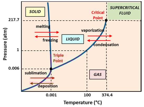 Several new liposome formation methods employ a supercritical fluid (SCF), i.e., a fluid maintained under supercritical temperature Tc and pressure Pc (see Figure 8). In this state, SCFs are excellent solvents for many lipids components. The variations in their temperature (or pressure) lead to sensitive modifications in their density and facilitate the solubility of a large variety of active components in the SCF. For those main reasons, SCFs are progressively replacing the organic solvents, as they favor a high-performing purification and separation procedure. [106,107]. More specifically, supercritical carbon dioxide (SC-CO2) represents a widely used organic solvent substitute, and is one of the most widely used non-toxic and environmentally friendly dense gases. Moreover, it has values of the critical parameters (i.e., temperature Tc = 31.1 °C and pressure Pc = 73.8 bar) that are easily accessible for a large variety of labile bio-materials.