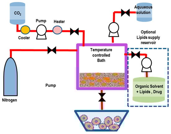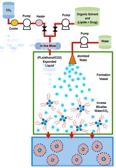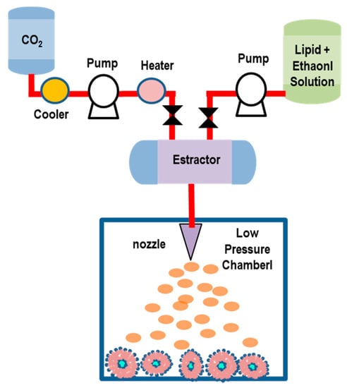 The general supercritical fluid method is characterized by two stages [106,107]. Initially, in the high-pressure (P = 250 bar) part, the dissolution of the lipids in supercritical carbon dioxide is performed. Successively, the obtained (supercritical) homogeneous solution is successively expanded at the temperature of T = 60 °C, with the addition of (a small amount, of about 7% v/v) of ethanol. Interestingly, the ethanol total amount is 15-times lower than in the ethanol injection method. The expanded liquid is then mixed (injected through a nozzle) with a water phase, and liposomes (with encapsulated water-soluble drugs) are formed. This method produces large liposomes with sizes in the range of 0.2–4 μm, while only 3% of the liposomes are usually subjected to degradation [107,108]. In a variation of this method, the phospholipid(s) are initially mixed, while the SCF and the co-solvent mixture with the aqueous phase is successively decompressed by spraying it (through a nozzle) [108].