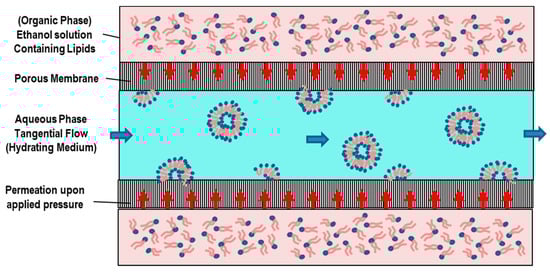 The extrusion method consists in the extrusion through pore-containing membranes (with sizes ranging from 1 mm down to 25 nm). A heating block set around the extruder allows for performing the extrusion above the phase-transition temperature of the phospholipids. Several passes through the polycarbonate membrane filters allow for the formation of (narrow-size distribution) LUV liposomes with dimensions close to the membrane pores’ sizes. This method allows for a reproducible result of the final liposome product, as evidenced by several investigations performed on various lipid formulations [95,96,97]. A variation of this method is given by the maximator device, an extrusion setup consisting of a thermo-stable supply vessel connected to a high-pressure pumping system [96].