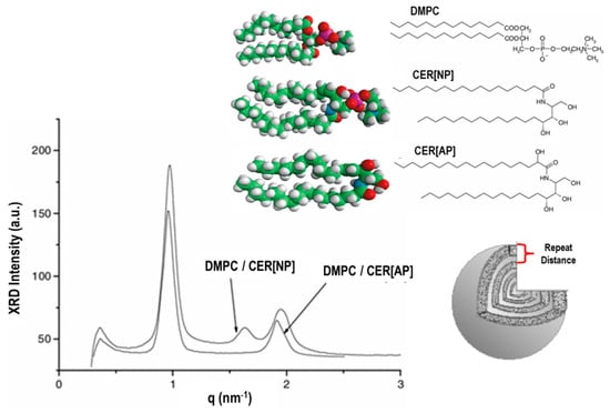 - Kiselev, M.; Zemlyanaya, E.V.; Ryabova, N.Y.; Hauß, T.; Almásy, L.; Funari, S.S.; Zbytovská, J.; Lombardo, D. Influence of ceramide on the internal structure and hydration of the phospholipid bilayer studied by neutron and X-ray scattering. Appl. Phys. A 2014, 116, 319–325. [Google Scholar] [CrossRef]