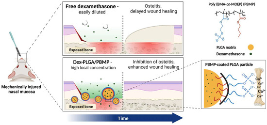 In this study, we envisioned that the local release of corticoids only around the wounded area and exposed bones using PBMP-coated PLGA microparticles would effectively prevent the development of osteitis with minimal side effects. The PBMP-coated PLGA particles could bind the exposed bone after the surgery and slowly release the encapsulated corticoids to maintain the effective concentration in the tissues only around the particles adhered to the bone (