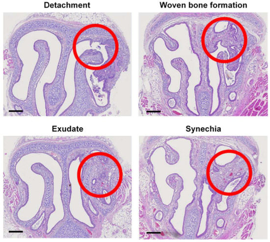 Figure 4, the mechanical injury of the mouse nasal mucosa using an interdental brush could induce synechia, exudate, fibrosis, osteoblastic activity with woven bone formation, and the characteristics of neo-osteogenesis in the tissue near the injured position. The postoperative neo-osteogenesis model was established using this method.