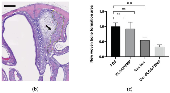 Figure 5). Intranasal administration of free Dex resulted in an approximately 50% reduction in the woven bone formation on average, but the difference was not statistically significant due to the large standard deviation. The sustained release from the PLGA/PBMP particles might maintain the Dex concentration around the exposed bone area for a longer period than free Dex to inhibit postoperative bone remodeling more effectively.