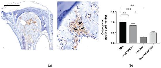 Figure 6). However, in osteocalcin activity, Dex-PLGA/PBMP showed a slightly higher average value than free Dex, although the difference was not statistically significant. Since osteocalcin is mainly expressed in the late stage of bone remodeling, we should further investigate the time-dependent relationship between osteocalcin expression and woven bone formation in future studies.