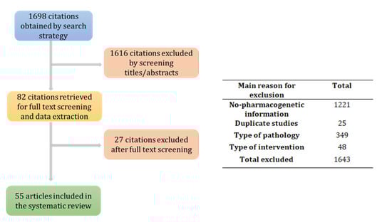 This systematic review was conducted according to the Preferred Reporting Items for Systematic Reviews and Meta-analyses (PRISMA) statements [18]. The literature search included the following databases: MEDLINE, PharmGKB [19], EU Clinical Trials Register and ClinicalTrials.gov. The search strategy included similar keywords in all databases: acute myeloid leukemia, polymorphism (or SNP, or single nucleotide polymorphism or pharmacogenetics or pharmacogenomics), cytarabine, anthracyclines (idarubicin, daunorubicin), FLT3 inhibitors (midostaurin, gilteritinib), IDH inhibitors (ivosidenib, enasidenib) or CD33 inhibitors (gemtuzumab ozogamicin) or hypomethylating agents (azacitidine, decitabine) or BCL2 inhibitors (venetoclax). Two independent reviewers (APM and MSR) independently screened all of the titles and abstracts and evaluated each article. Disagreements were resolved by consensus and in concordance with a third reviewer (JL), when necessary. Studies that fulfilled the following criteria were included: (1) studies with pharmacogenetic biomarkers analysed in diagnosed AML patients’ cohorts in which any of the following were prescribed: cytarabine, idarubicin, daunorubicin, midostaurin, gilteritinib, ivosidenib, enasidenib, gemtuzumab ozogamicin, azacitidine, decitabine, or venetoclax; and (2) studies reporting efficacy and outcome variables. The systematic search retrieved 1698 citations, before removal of duplicates, these being the most relevant included in our review. The PRISMA flow chart of the selection procedure and main reasons for exclusion are detailed in Figure 1.