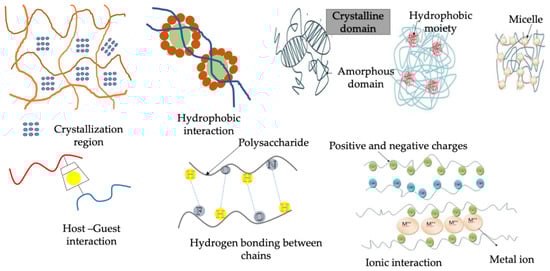 The classification of hydrogel network structures on the basis of pore size includes macroporous, nonporous, and microporous [18]. Macroporous hydrogels have a large pore size in the range of 0.1 to 1 μm, and the drug release from these hydrogels occurs via a diffusion coefficient mechanism. Nonporous hydrogels possess macromolecular characteristics with a size range of 10–100 Å, similar to mesh-like constructs produced as a result of monomer or polymer chain crosslinking and drug release via a diffusion coefficient mechanism [19,20,21]. In the case of the microporous hydrogel, the size of pores normally -scales between 100–1000 Å, and drug release from microporous hydrogels occurs via convection and diffusion [14,22]. The crosslinking in hydrogels is of two types comprising physical and chemical crosslinking. Numerous methods involved in physical crosslinking of hydrogels are crystallization [23], hydrogen bonding [24,25], host–guest interaction [26], hydrophobic interaction [27,28] and ionic interaction [29,30,31]. On the other hand, hydrogel formulations that are chemically crosslinked have covalent or ionic bonds among the polymer chains [32,33], and their preparation occurs by techniques such as polymerization through irradiation, [34,35,36], copolymerization [37,38], click chemistry, dynamic covalent chemistry and enzymatic crosslinking [39,40].