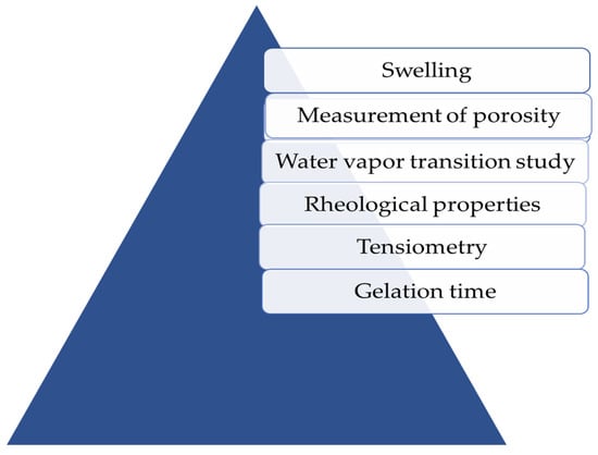 Gelation time relates to the amount of time it takes for a polymer formulation in the liquid form to transform into a gel. The hydrogel exhibits in situ gelation phenomena through ionic crosslinking or after temperature or pH alteration. Determination of a sol-gel transition period via a technique of inverted tube is well known [114]. For this analysis, tubes holding solutions of discrete concentrations in final form can be equilibrated at 37 °C, and at varying time periods while the tubes are inverted. The duration during which the flow was not seen in gel is considered as the time of gelation [115]. The sol-gel phase transition behavior of hydrogels can be also investigated by rheometry. In order to obtain sophisticated hydrogels with desired mechanical, physicochemical and functional attributes, the study of sol-gel transition with sensitive rheological method is also needed.