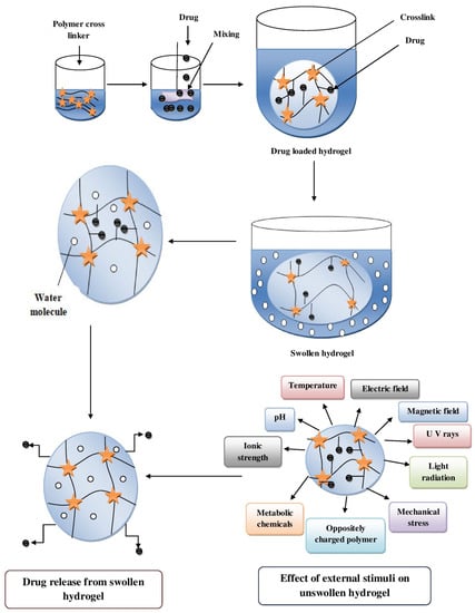 The most common method of releasing the drug or molecules from the hydrogels is passive diffusion [129,130]. In terms of the release behavior of therapeutic agents, the hydrophilic nature of a hydrogel distinguishes it from non-hydrophilic polymer matrices. Drug release mechanisms from hydrogels can be classified as diffusion controlled, swelling controlled and chemically controlled. Diffusion-controlled behavior is the most widely applicable mechanism to characterize the drug release from hydrogels. The mesh size of a hydrogel matrix influences the diffusion of drug out of the matrix of the gel. The degree of crosslinking, chemical structure of components, type, and intensity of the external stimuli also alter the drug diffusion out of a hydrogel matrix. If diffusion of a drug is substantially faster than the distention of a hydrogel, the swelling-controlled mechanism plays an important role in release behavior study. Furthermore, chemical reactions occurring within the gel matrix dictate chemically controlled release. There are three important functions of hydrogels, i.e., controlled release rate, drug storage region, and drug release drive, which maintain the effective release of the entrapped drug into the body after administration. With this, by altering the gel structure with different stimuli i.e., temperature, electric field, pH, and ionic strength, the release of a drug can also be controlled easily (Figure 4). Though the delivery of a lipophilic drug through hydrogel is difficult due to non-uniformity, poor solubility, limited in vivo stability, and dissolution problems, it can be improved to some extent by enhancing solubility, stability, and bioactivity so that the release of a drug can occur in a controlled or sustained manner [41,130]. Moreover, hydrogels can also mask the bitter taste and odor of medications, and no systemic toxicity is seen in hydrogel-based delivery systems [41,130]. Hydrogel drug delivery approaches for various disorders are discussed in the subsequent section.