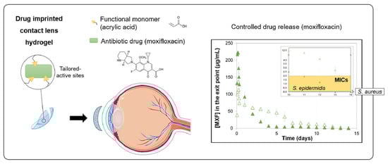 - Silva, D.; de Sousa, H.C.; Gil, M.H.; Santos, L.F.; Oom, M.S.; Alvarez-Lorenzo, C.; Saramago, B.; Serro, A.P. Moxifloxacin-imprinted silicone-based hydrogels as contact lens materials for extended drug release. Eur. J. Pharm. Sci. 2021, 156, 105591. [Google Scholar] [CrossRef] [PubMed]