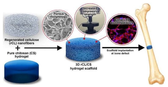 - Maharjan, B.; Park, J.; Kaliannagounder, V.K.; Awasthi, G.P.; Joshi, M.K.; Park, C.H.; Kim, C.S. Regenerated cellulose nanofiber reinforced chitosan hydrogel scaffolds for bone tissue engineering. Carbohydr. Polym. 2021, 251, 117023. [Google Scholar] [CrossRef] [PubMed]