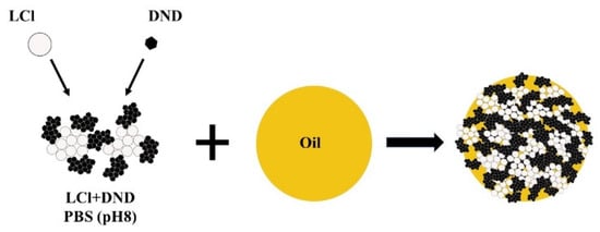 Direct emulsions stabilized by nanoparticles were prepared by the addition of 0.1 M NaOH to 0.25 wt.% dispersions of LCl, DNDs, or their mixtures in a phosphate buffer to adjust pH to 8. Then, the mixture was ultrasonically treated (Hielscher UP400S homogenizer) for 30 s at 20% amplitude and shaken on an orbital shaker (1000 rpm) for 30 min. Soybean oil was added to the resulting particle dispersion in a ratio of 1:9 and homogenized ultrasonically at 20% amplitude for 2 min.