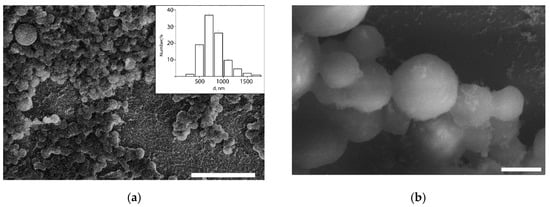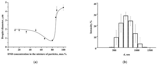 Figure 5a). It was found that the colloidosome diameter at a DND concentration of 10–50 wt.% is about 2 μm. The further increase of DND concentration up to 80 wt.% leads to a decrease of the average diameter of colloidosomes to 750 nm (