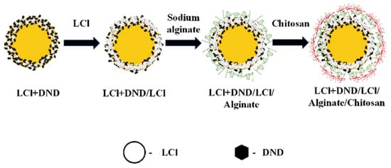 Figure 7 shows the scheme of the capsule formation. To create a multilayer shell, LCl nanoparticles, positively charged at pH 4, were applied as the first additional layer on the colloidosomes. The use of nanoparticles, in contrast to polyelectrolytes, did not lead to significant aggregation of emulsion droplets. In addition, it was shown in [