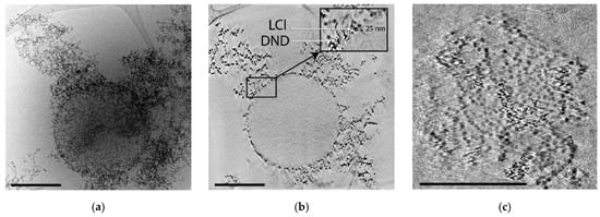 Figure 9b) demonstrates that a ~30 nm thick shell, consisting of a monolayer of LCl and clusters of DND nanoparticles, is formed on the surface of the oil core, with nanoparticles weakly immersed in oil. Extended clusters of nanoparticles, which may have been formed from the shells of other capsules destroyed due to the peculiarities of the vitrification procedure, can also be observed around the capsule.