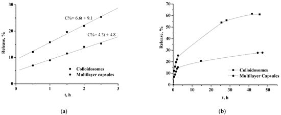 Figure 10a). The ratio of the release rate constants for monolayer and multilayer shells is approximately equal to 1.5. The initial release profile did not start from zero as a result of a partial release of the substance from the capsules before measurements, due to the permeability of the shell. The release of TQ from colloidosomes characterized by the “initial-burst effect” is followed by a slowing down, when 61% and 28% of TQ were found in the supernatant in 45 h for the initial colloidosomes and multilayer capsules, respectively. Thus, the formation of the additional shell of nanoparticles and polyelectrolytes significantly slowed the release of the drug.