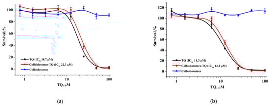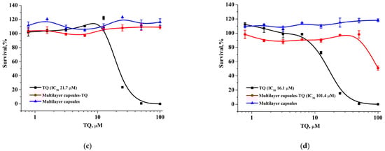 Figure 11a,b). Furthermore, we found that capsules with a modified surface had the opposite effect on cytotoxicity: the encapsulation of TQ in modified capsules significantly reduced its antitumor activity in both cell lines. BJ-5ta cells were more sensitive to TQ-loaded modified capsules with relatively low IC