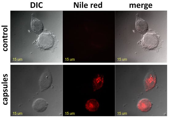 The MCF-7 cells were plated onto cover glasses into 24-well plates (2 × 104 cells in 1 mL of culture medium per well) the day before the experiment. Then, 125 µL of capsules with Nile Red (1% vol., 0.05 mg/mL dye) were added to cells for 2 h. After incubation, the cells were washed thrice with PBS, fixed in 2% p-formaldehyde, washed twice with PBS supplemented with 50 mM glycine to decrease the autofluorescence, and embedded in Mowiol. The fluorescence intensity and distribution of capsules in the cells were studied using a Carl Zeiss Cell Observer Z1 confocal microscope with a 100× objective. The photos were finally processed with Bitplane Imaris 7.2.3 (Bitplane AG, Zürich, Switzerland) and Adobe Photoshop CS3 (Adobe Systems Inc., Mountain View, CA, USA).