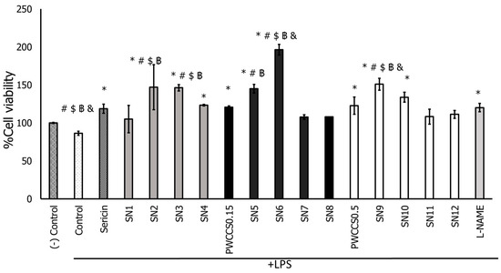 Effect of sericin, purple waxy corn cob extract solution 0.15 and 0.50% (PWCCS0.15 and PWCCS0.5), sericin-hydrogel formulations (SN1–SN12), and L-NAME 200 μM (L-NAME) on cell viability of RAW 264.7 cells treated with LPS. Data represent the mean ± SEM of three replicates. Statistical significance was evaluated by Dunnett post-hoc test (* p < 0.05 compared with LPS-treated cells (control), # p < 0.05 compared with L-NAME 200 μM, $ p < 0.05 compared with PWCCS0.15, ฿ p < 0.05 compared with sericin, & p < 0.05 compared with PWCCS0.5).
