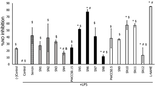 Effects of sericin, sericin-hydrogel formulations (SN1–SN12), L-NAME 200 μM, purple waxy corn cob extract solution 0.15% (PWCCS0.15), and 0.50% (PWCCS0.5) on nitric oxide production by LPS-stimulated RAW 264.7 cells. Data represent the mean ± SEM of three replicates. Statistical significance was evaluated by Dunnett post-hoc test, * p < 0.05 compared with (−)control, # p < 0.05 compared with SN2, ฿ p < 0.05 compared with sericin, $ p < 0.05 compared with L-NAME 200 μM.