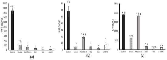 Inflammatory cytokine levels of TNF-α (a), IL-1β (b), and IL-6 (c) in LPS-stimulated RAW 264.7 cells. Data represent the mean ± SEM of three replicates. Statistical significance was evaluated by Dunnett post-hoc test, * p < 0.05 compared with control (LPS-treated group), # p < 0.05 compared with SN2 and $ p < 0.05 compared with L-NAME.