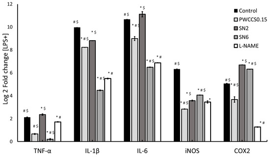 Inflammatory gene expression in LPS-stimulated RAW 264.7 cells. Data are relative expression levels of TNF-α, IL-1β, IL-6, iNOS, and COX-2 from control (+LPS), PWCSS0.15, SN2, SN6, and L-NAME. Data represent the mean ± SEM of three replicates. Statistical significance was evaluated by Dunnett post-hoc test, * p < 0.05 compared with control (+LPS), # p < 0.05 compared with SN2 and $ p < 0.05 compared with 200 μM L-NAME.