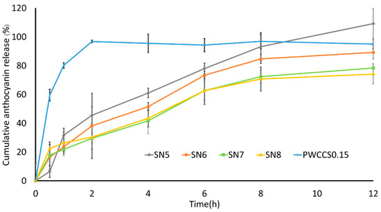 The anthocyanin release profiles of hydrogels containing 0.15% w/v PWCC extract (SN5–SN8) and 0.15% w/v PWCC extract solution (PWCCS) are shown in Figure 6. All hydrogel formulations released their highest cumulative anthocyanin content within 12 h. Whereas PWCCS provided the highest cumulative anthocyanin level within 2 h. Therefore, hydrogel formulations (SN5, SN6, SN7, and SN8) could prolong the release of anthocyanins. The alginate concentrations in SN5, SN6, SN7, and SN8 were varied at 0, 0.2, 0.3, and 0.4% w/v, respectively. However, formulations SN5, SN6, SN7, and SN8 showed similar release profiles. The formulation that contained the lowest alginate concentration (SN6) released more anthocyanins than the formulations with higher alginate concentrations (SN7 and SN8) (Figure 6). However, formulation SN5, which contained no alginate, released the highest cumulative amount of anthocyanin.