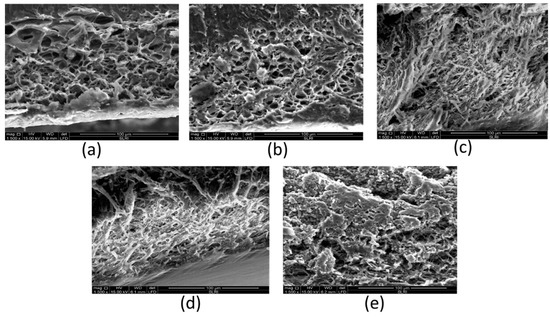 SEM images of cross-section scaffold; SN2 (a), SN5 (b), SN6 (c), SN7 (d), and SN8 (e).