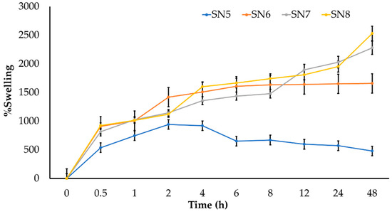 The results of the swelling study of hydrogels SN5, SN6, SN7, and SN8 are presented in Figure 8. The hydrogels with alginate (SN6, SN7, and SN8) showed a higher percentage of swelling and could preserve the interaction in the hydrogel network better than the hydrogel without alginate (SN5). The interaction in the SN5 hydrogel might be easily broken within 4 h while performing the swelling study. The swelling of the hydrogel is also important for controlled drug release. Initially, swelling allows for rapid diffusion of anthocyanins from the hydrogel since the diffusion release mechanism occurs at the outer surface of the polymer and not in the core porous structure. Therefore, the release occurs rapidly. Later, the compound residing in the core porous structure of the hydrogel is slowly released.