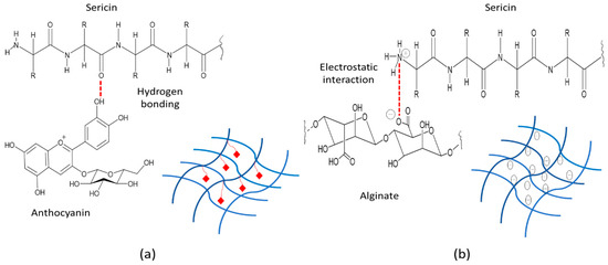 Illustration of sericin, alginate, and anthocyanin interactions (a) Sericin-anthocyanin interaction: hydrogen bonding (b) Sericin–alginate interaction: electrostatic interaction.