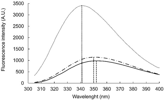25] and thereby stabilize the WYKYW–GM1 interaction over the membrane surface. The Trp fluorescence maximum wavelength depends on the environment; relocation of the aromatic side chain from an aqueous solvent to a hydrophobic environment causes a blue shift [