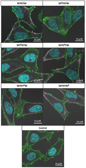 15]. The endocytotic pathways were tested with inhibitor experiments, demonstrating that lipid raft-mediated internalization is the major pathway for this process. The involvement of GM1 in the mechanism was supported by Cholera toxin co-localization and an inhibition experiment with the GM1 binder lectin galectin-1. Cell lines expressing different amounts of cell surface GM1 displayed internalization efficiency in accordance with their GM1 content. Inducing endocytosis with WYKYW avoided lysosomes and retained the functional structure of the cargo, which justifies further investigations.