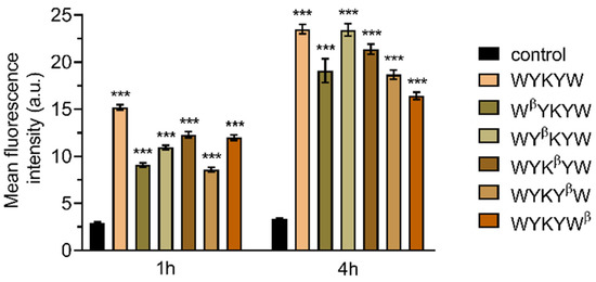 Figure 5). HeLa cells were incubated with the carrier–cargo complexes for 1 or 4 h at an extracellular concentration of 80 nM. The α/β-peptidic tags were able to induce endocytosis. We carried out an AI-based quantitation with the different analogues (