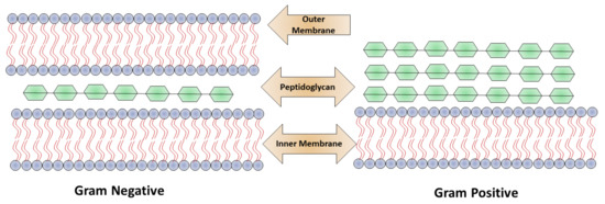 Based on the bacterial cell wall structure, bacteria are classified mainly into two classes: Gram-positive and Gram-negative as shown in Figure 1. The cell wall structure of Gram-positive bacteria consists of a 15–100 nm thick layer of peptidoglycan and cytoplasmic membrane with techoic acid. In Gram-negative bacteria, the cell wall contains a polymeric chain of techoic acid present in phosphate, which is responsible for the negative charge, and in solution serves as a binding site for divalent cations [5]. Gram-negative bacteria contain a thin (20–50 mm) layer of peptidoglycan, which is followed by a cytoplasmic membrane, and which is protected by lipopolysaccharide consisting of a hydrophobic lipid bilayer. The function of the lipid layer is to reduce the penetration ability of antibacterial agents that are hydrophobic in nature, for example, detergents [12]. Due to the presence of phosphate, the membrane is negatively charged, and in lipopolysaccharides contain carboxylates as a component present on Gram-negative bacteria. The interactions of nanoparticles with the cell walls of the bacteria play a crucial role in the elimination of microbes.