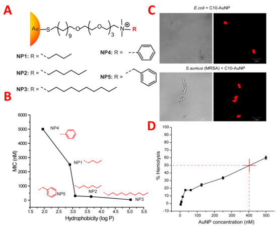 Figure 4. (A) Molecular structures of functional ligands on AuNPs. (B) MIC values (nM) of AuNPs bearing different hydrophobic surface ligands against laboratory E. coli DH5R. Log P represents the calculated hydrophobic values of the end groups. (C) PI staining showing NP 3 (C10-AuNP)-induced bacterial cell membrane damage. Scale bar is 5 μm. (D) Hemolytic activity of NP 3 at different concentrations. HC50 was estimated to be ∼400 nM (as denoted by the red cross in figure). Adapted with permission from [28], American Chemical Society, 2014.