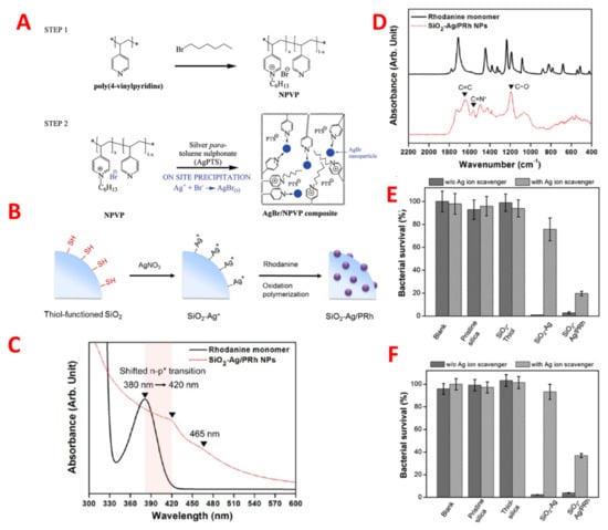 Figure 5. (A) Schematic of on-site precipitation method for the synthesis of dual action antibacterial composite material, AgBr/NPVP poly(4-vinylpyridine)-co-poly(4-vinyl-N-hexylpyridinium bromide). Adapted with permission from [31], published by American Chemical Society, 2006. (B) Schematic Illustration of the Synthetic Procedure for SiO2−Ag/PRh Nanoparticles (C) FTIR and (D) UV−vis spectra of rhodanine monomer (black solid line) and SiO2−Ag/PRh nanoparticles (red dotted line). (D,E) Antibacterial assessment of four different particles (pristine silica, thiol-silane-treated silica, SiO2−Ag, and SiO2−Ag/PRh) dispersed in solution and blank water toward E. coli and (F) S. aureus with or without silver-ion scavenger (100 μL of neutralizer solution) at pH 7.4. Adapted with permission from [33], American Chemical Society, 2013.