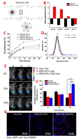 Figure 6. (A) Schematic charge conversion of PEG-b-PCL-bPAE/Van nanoparticles due to pH. Zeta potential (B) and in vitro Van release (C) profiles of PEG-b-PCL/Van and PEG-b-PCLb-PAE/Van nanoparticles under different pH conditions (n = 4). (D) In vitro stability of PEG-b-PCL-b-PAE/Van nanoparticles in PBS buffer (0.01 M) for 24 h. (E) In vivo fluorescence images of inflammation-bearing mice after 2 h, 12 h and 24 h of Van injection and (F) statistical analysis and (G) representative CLSM images of cutaneous inflammation slices from inflammation-bearing mice after 24 h of Van injection. (n = 3, ** p < 0.01). Adapted with permission from [51], Royal Society of Chemistry, 2016.