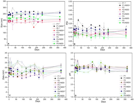 Zeta potential values of formulations were in the range of −20 to −40 mV for the control (NLC) and NLC/INDO (Figure 1C) formulations, respectively. F5 and F5-INDO formulations showed no statistically significant differences (p > 0.05) in terms of Zeta values over 365 days. Finally, the pH values ranged from 3.0 to 3.5 for all samples (Figure 1D) and remained constant (p > 0.05) over the time.
