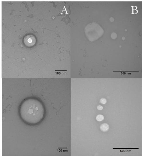 TEM micrographs (60 kV) of F5 (above) and F5 loading 2% indomethacin (F5-INDO) (below), at magnifications of 100,000× (A) and 60,000× (B).